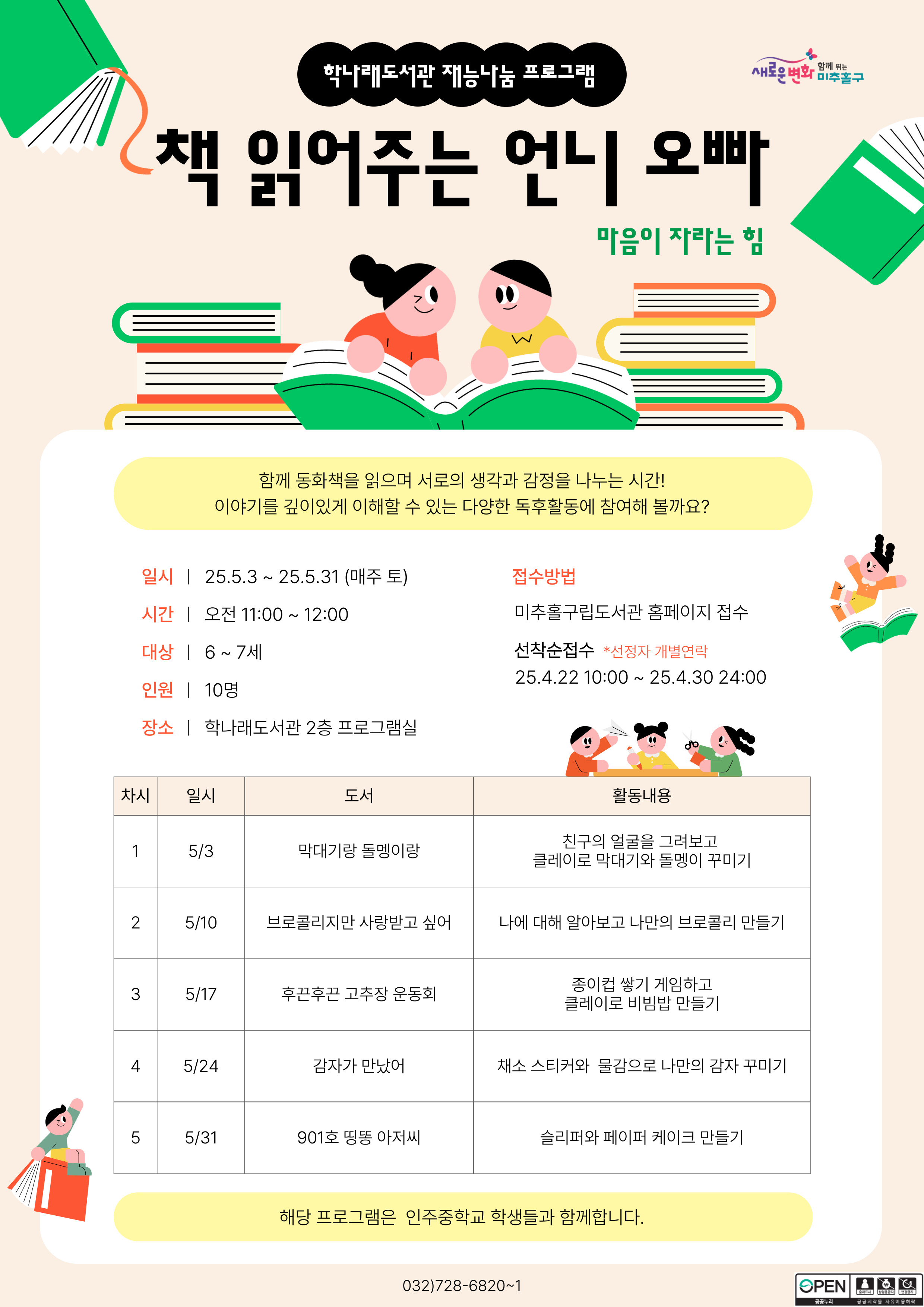 미추홀구립도서관 홈페이지 → 독서문화 프로그램 → 프로그램 안내 → 학나래도서관