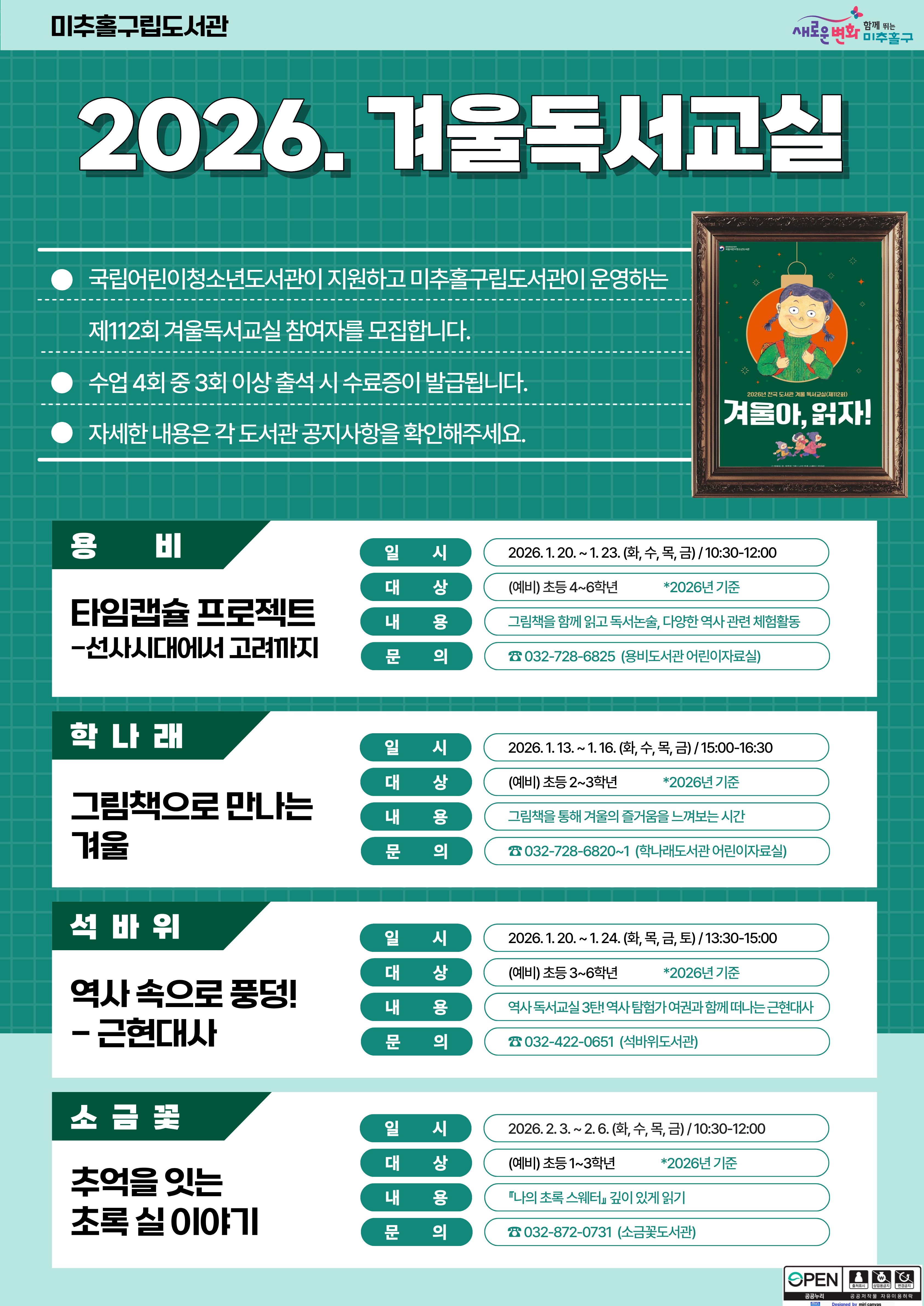 국립어린이청소년도서관과 함께하는 2026년 겨울독서교실은 용비, 학나래, 석바위, 소금꽃도서관에서 진행됩니다.