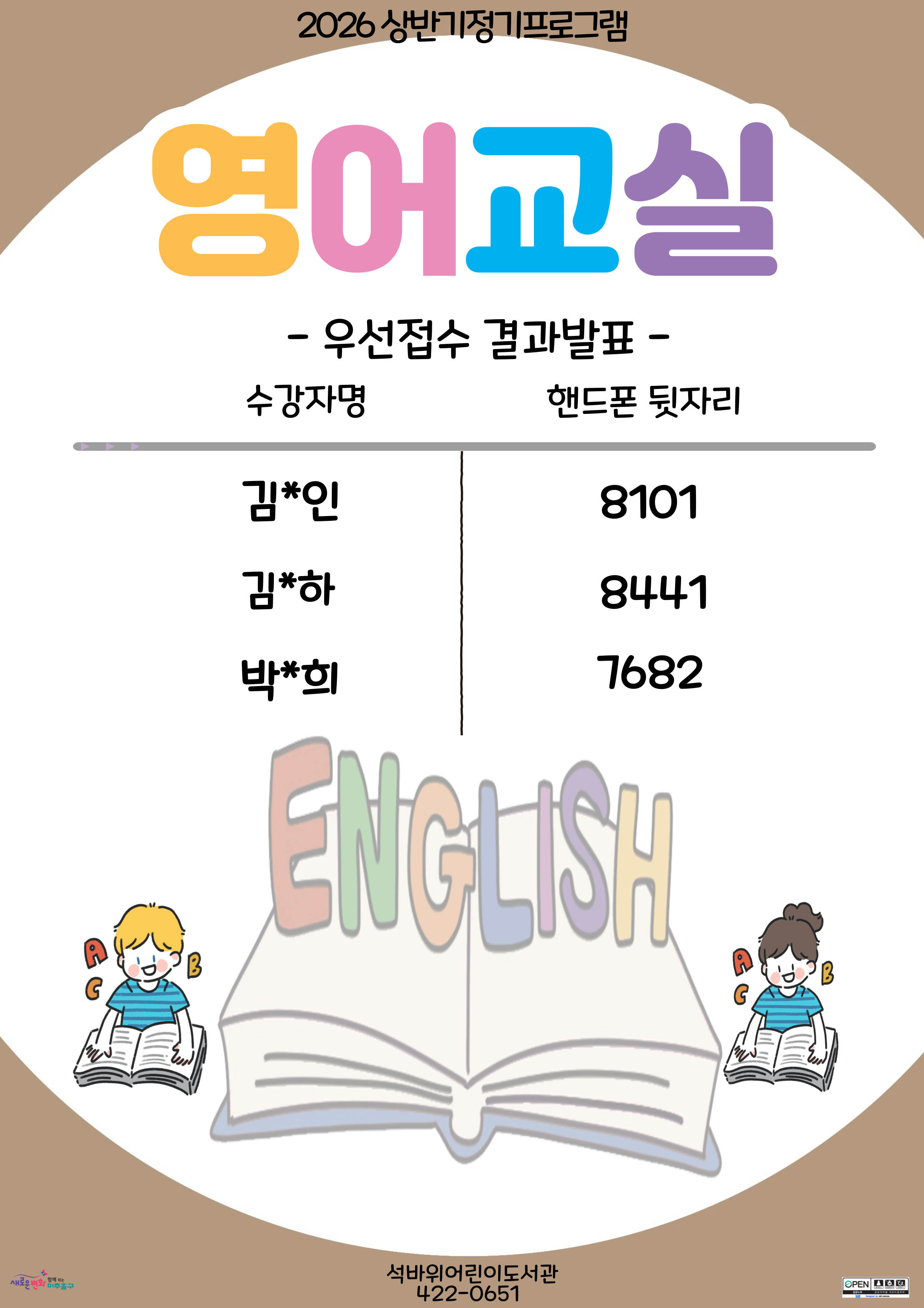 [안내] 2026 석바위도서관 상반기 정기 프로그램 <리듬톡톡, 영어톡톡> 우선접수 선정자 안내