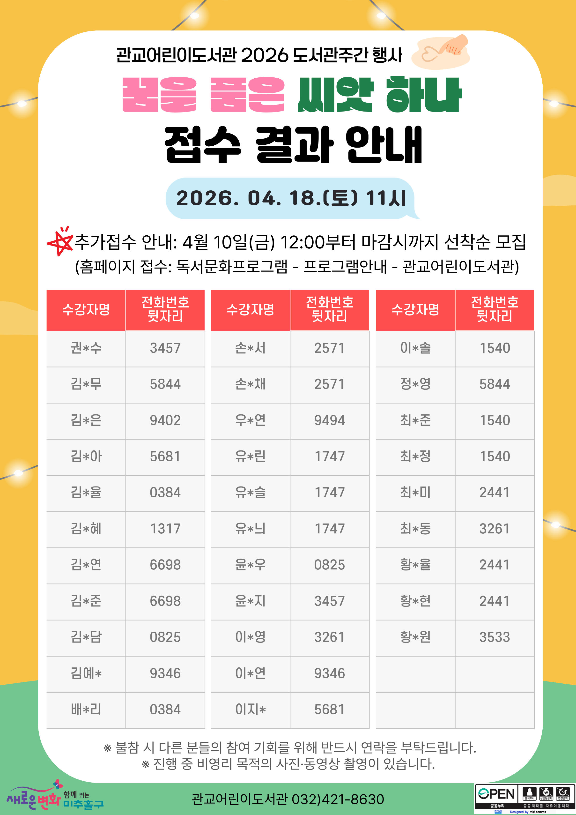 - 모집인원 미달로 4/10(금) 12:00부터 마감시까지 추가 접수를 진행합니다.(홈페이지 접수: 독서문화프로그램 - 프로그램안내 - 관교어린이도서관)