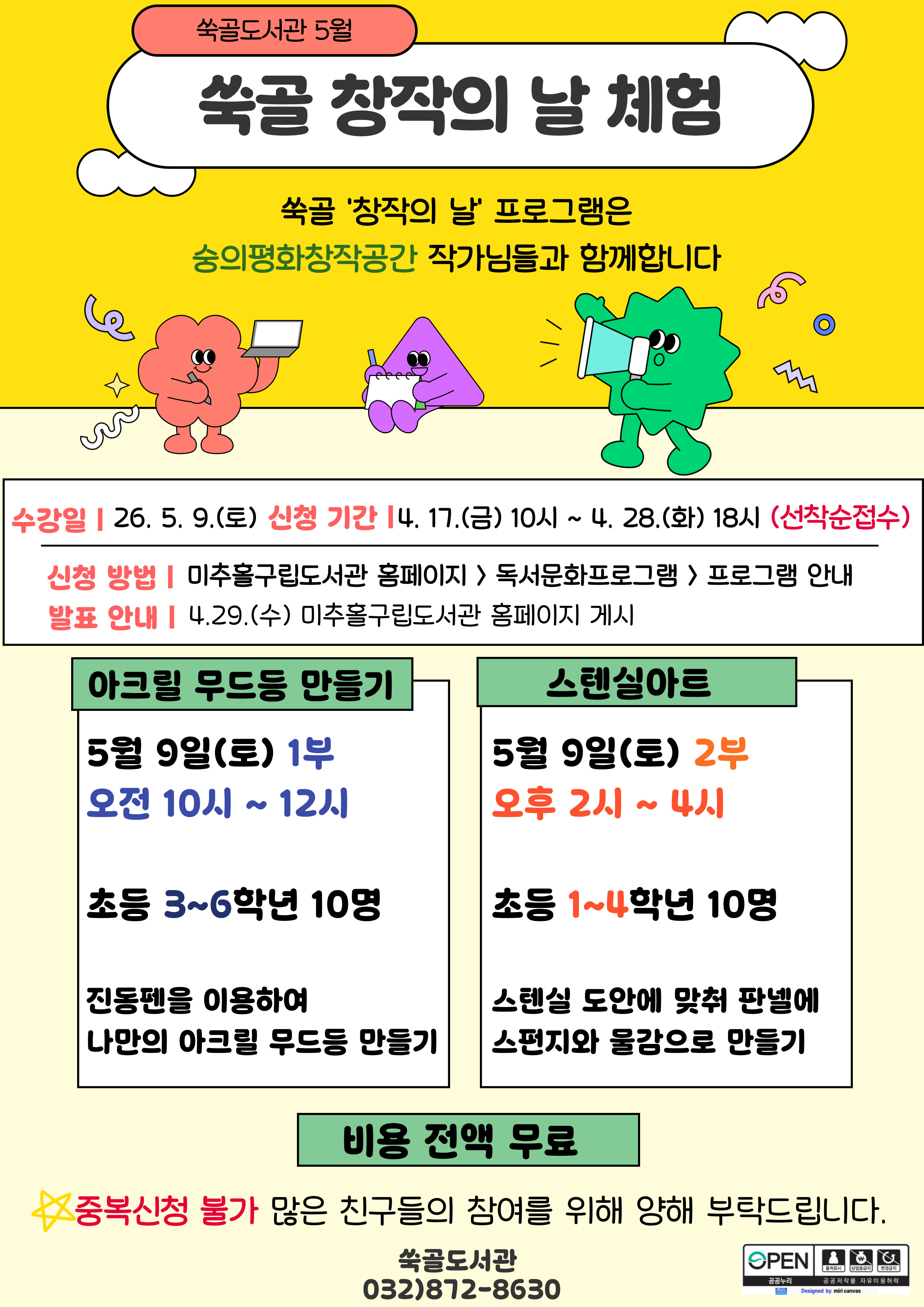 * 쑥골어린이도서관 <창작의 날 체험>은 5/9일 토요일에 1부, 2부가 진행됩니다. 연령에 따라 나눠져있으니 참고 부탁드리며 중복 신청은 불가합니다.
