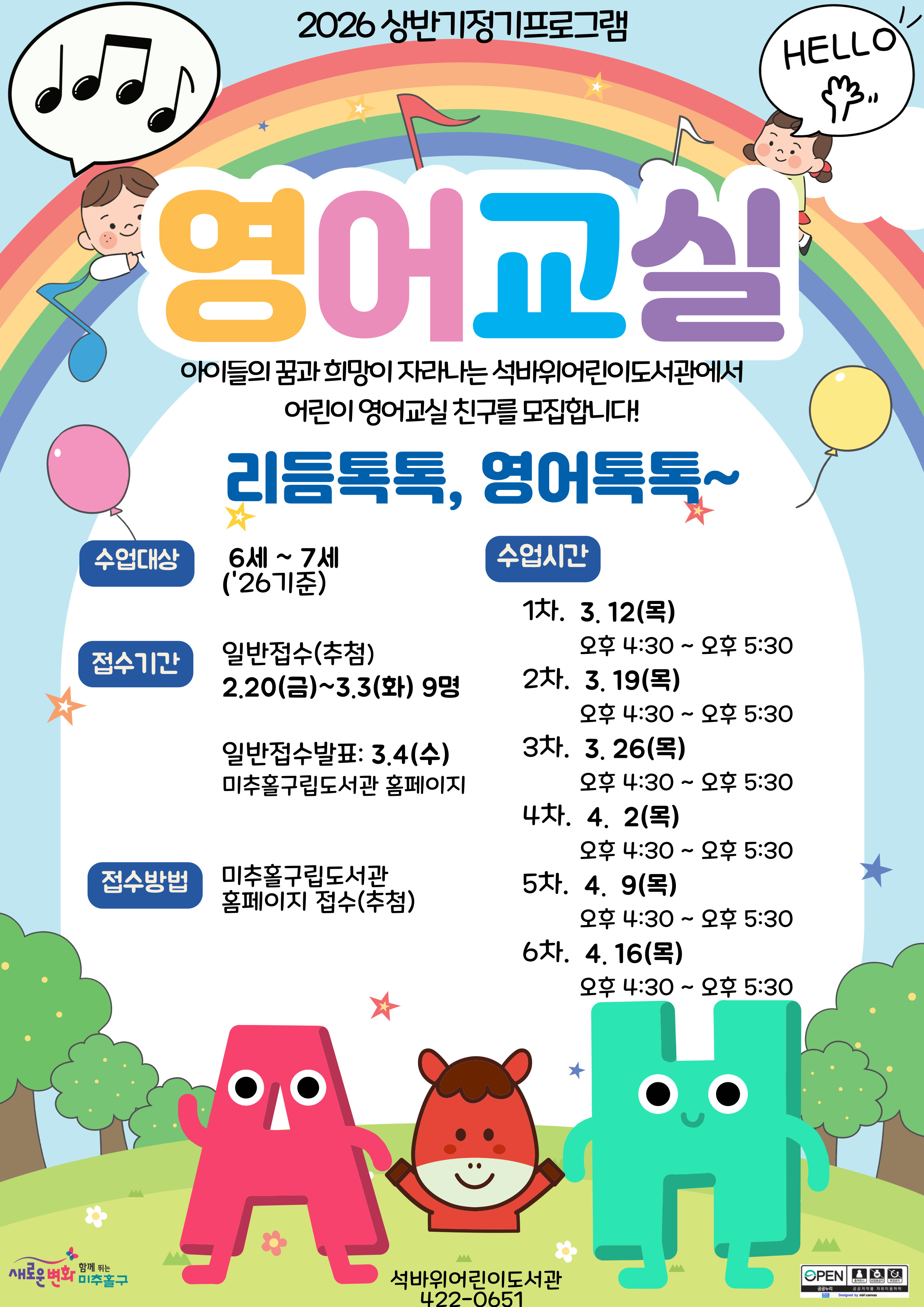 [안내] 2026 석바위도서관 상반기 정기 프로그램 <리듬톡톡, 영어톡톡> 일반접수 안내 |